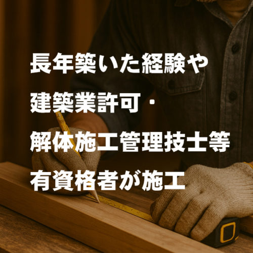 建築業許可・解体施工管理技士など有資格者が施工 アイテム1のキャプション アイテム2のキャプション アイテム3のキャプション アイテム4のキャプション アイテム5のキャプション アイテム6のキャプション 建築業許可、解体工事施工技士などの国家資格を持つスタッフが現場を担当。安全管理を徹底した施工で安心してご依頼いただけます。 解体工事について名 建築業許可・解体施工管理技士など有資格者が施工 サンプルボタン